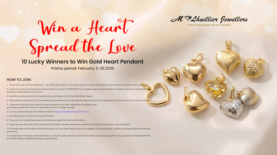 1. This promo will run from February 5 - 28, 2026 and is open to all customers who make a purchase at any M Lhuillier Jewellers showroom.