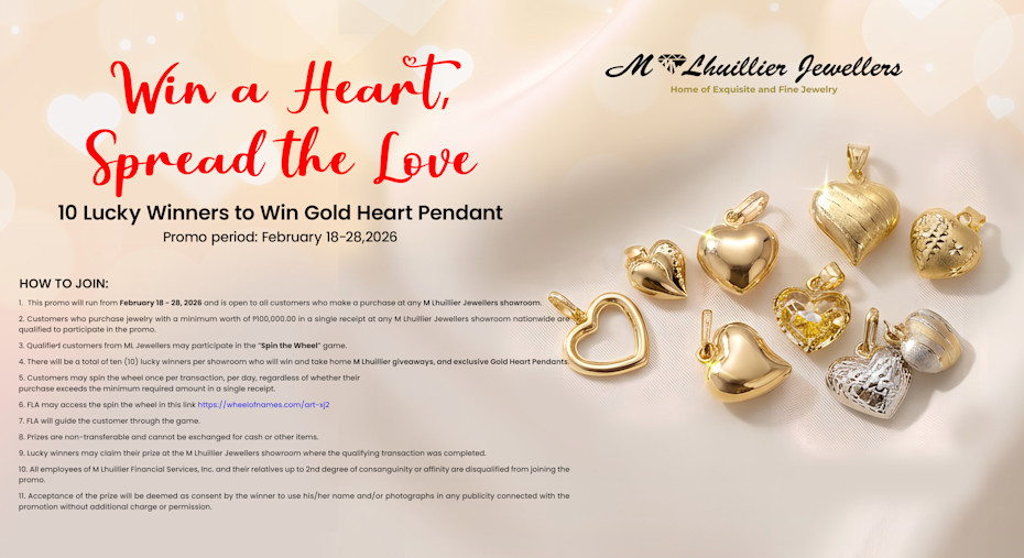 1. This promo will run from February 5 - 28, 2026 and is open to all customers who make a purchase at any M Lhuillier Jewellers showroom.